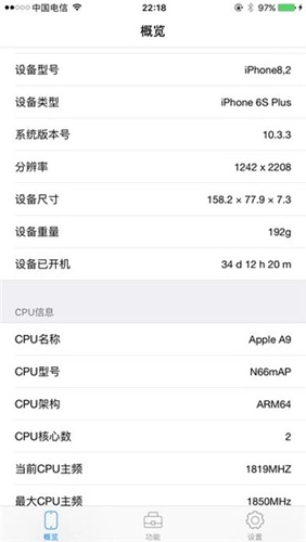 设备概述囊括了当前设备的系统版本号、设备类型、可用的存储器大小、是否支持视网膜显示、MAC地址和IP地址。如果在没连接网络的情况下,IP地址显示0.0.0.0。然后,后面就是比较精彩的部分了,CPU信息。这个是目前手机中鲜有的,里面包括了CPU类型、CPU架构(ARMv7、ARMv7F等)、核心个数、字节序(肯定是小端的)、Cache行大小(有些设备是32字节,有些设备是64字节)、L1指令Cache大小、L1数据Cache大小、L2Cache大小、L3Cache大小,然后是CPU主频、总线频率,是否在用户模式下支持性能监视器