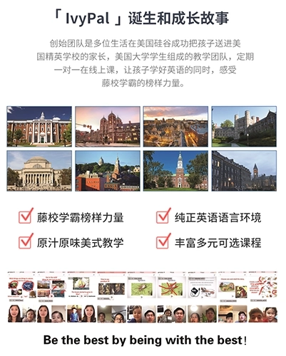 1.IvyPal教师团队均来自常春藤和美国Top30顶级学府,其中不乏Cornell,Pennsylvania和Princeton等世界名校的优秀学子。藤师各有所长,文艺双全,耐心热情,他们就是孩子成长的好榜样!