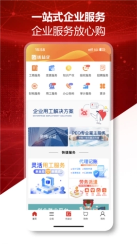 优益企App是专为企业打造的一站式服务平台,整合了工商服务、变更服务、知识产权、股权服务、招聘服务、财税服务、用工服务、办公物流、审计服务等丰富功能。企业借助该平台既能处理各类业务难题,又能获得专业顾问一对一的咨询解答支持,还可自主下单,从而推动企业高效发展,少走弯路。