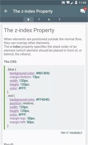 这里以学习CSS的“z-index”属性为例。这里介绍了“z-index”的概念,我们可以知道“z-index”是定义元素的先后顺序的。