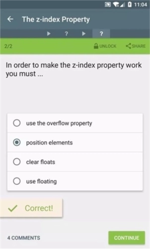 SoloLearn目前开设的课程包括Java、CSS、Python、C++、PHP等等,基本主要的编程语言均涉及到了。每一门课程都根据编程语言的特点,分成了不同的模块。我学习的是Python,就分为了基础概念、函数与模块、数据类型等多个模块,每个模块下又细分成了一个个的学习单元,每个学习单元又分为知识点与练习题。如果你有玩过RPG游戏、或者对游戏关卡有一定了解,你会发现,整个学习体验的确就像是在打游戏……