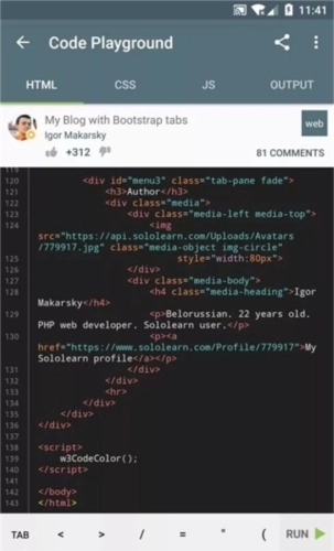 光学习是没有用的,实践更重要。然而,手机上“实践”——调试代码是一件非常蛋疼的事情,因为环境难以配置,除了使用Termux之类的终端应用别无他法,体验又上不去。但是,SoloLearn的CodePlayground功能很好的满足了手机上“实践”的需求(这里使用别人的代码做演示)。