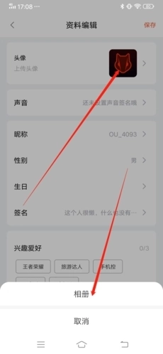 3、接下来点击“头像”,待弹出窗口后,选择点击其中的“相册”选项;