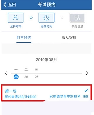 5、选好日期后查看申请人数与计划考试人数,确认无误后点击“预约”按钮。完成预约操作后,手机会收到验证码,将验证码准确填写进去,预约即可成功,页面会显示“受理中”状态。通常在考试前3至5天,会通知你预约成功与否的结果。