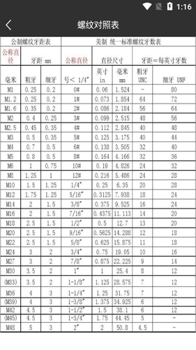 螺纹对照表涵盖了公制螺纹、美制螺纹的粗牙与细牙对照表。