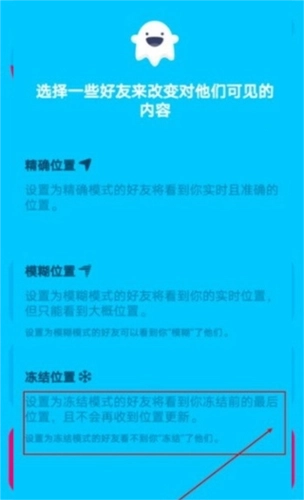 3、点击幽灵图标,操作后会看到相关提示:可设置冻结模式,若将好友设为该模式,后续将不再收到其任何位置更新(操作界面参考下图)