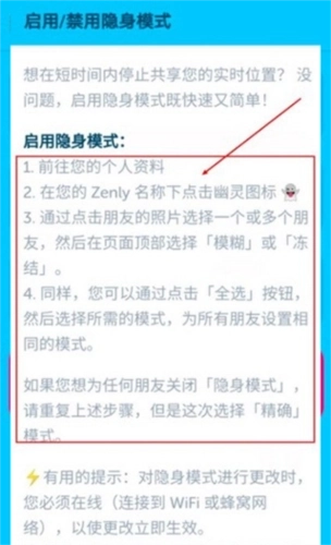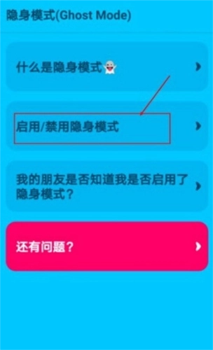 4、点击隐身模式(依次点击“联系我们”“联系我们”“提问”“发现Zenly”,操作步骤如下图所示),即可看到“启用/禁用隐身模式”选项。