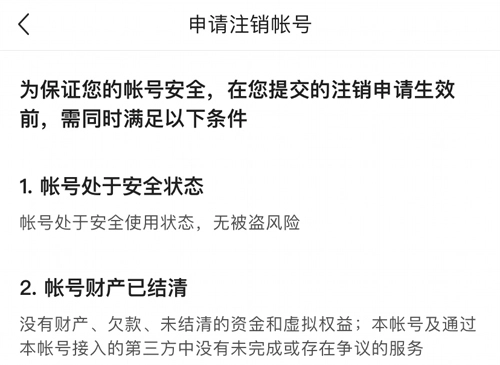 为保证你的帐号安全,在你提交的注销申请生效前,需同时满足以下条件: