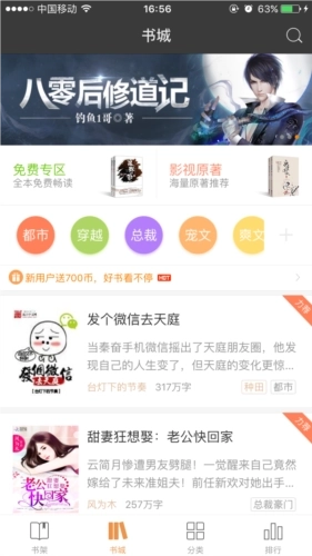 2、进入主界面后,点击下方第二个“书城”按钮,即可看到为你推荐的各类小说。