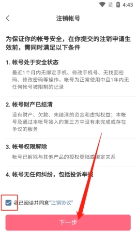4、仔细查看账号注销的相关条件,确认无误后勾选“我同意”选项,接着点击下方的“下一步”按钮。