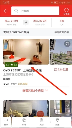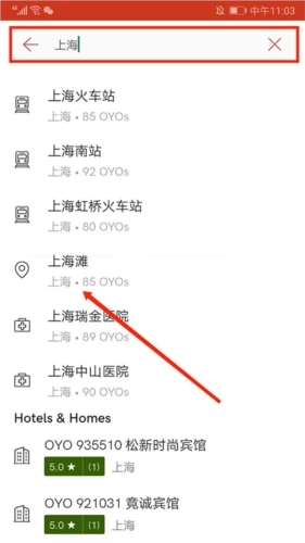 2、在“搜索框”中输入所需的酒店名称、城市或位置,这里我们以“上海”为例,选择“上海滩”这一选项。