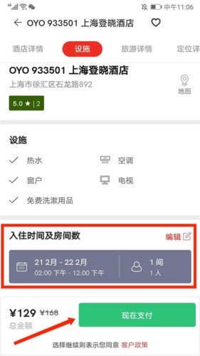 4、把“入住时间”和“房间数”设置好后,点击右下角的“现在支付”按钮就能完成订房。