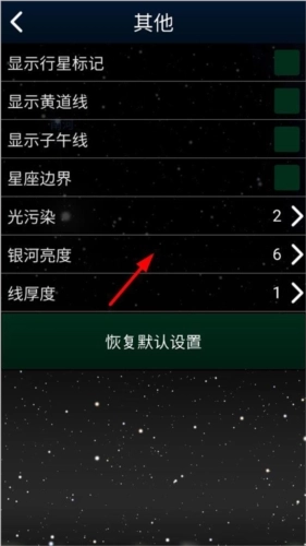 5、打开后可看到行星标记、黄道线、子午线等,用户点击银河亮度,将银河亮度调整至6然后返回页面即可清晰看到银河。