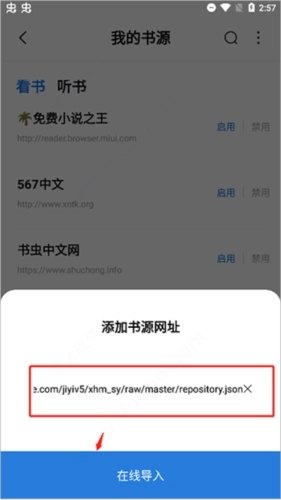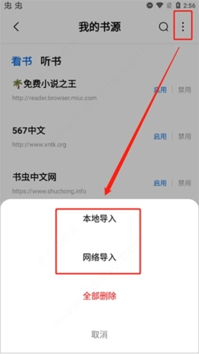 3、要是觉得现有的书源数量不够,也可以点击右上角的按钮自行导入书源,这里支持本地导入和网络导入两种方式。