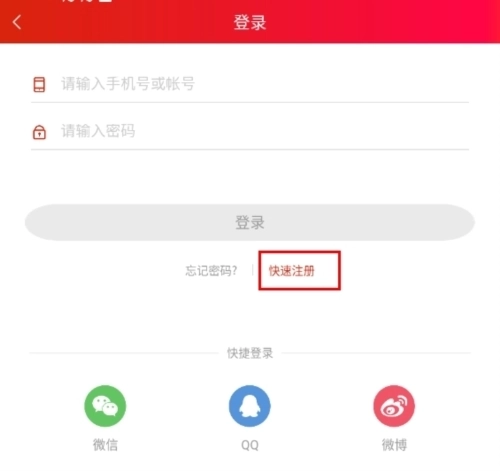 2、登录页面支持手机账号登录,也可使用微信、QQ、微博账号登录;若没有账号,可点击下方的快速注册按钮进行注册。