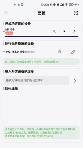 接受来自其它安卓设备的投屏,并且能对其它安卓设备进行控制。显示局域网设备的投屏不需要Root,通过Otg需要Root
