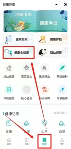 第二步:选择最下方“健康”→“健康合格证”。
