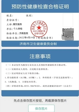 体检结束后三个工作日的上班时段(13:30-16:30),请凭条码前往济南医院查体中心领取纸质健康证。若条码不慎遗失,本人可持身份证领取。请注意,纸质健康证自可领取之日起两个月内未领取的,将作作废处理。