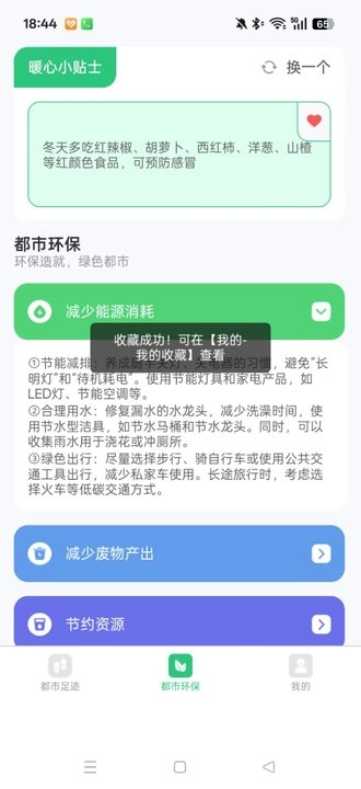 都市路人的收藏功能主要集中在都市环保页面,点击一篇环保知识页内容即可进行分享。