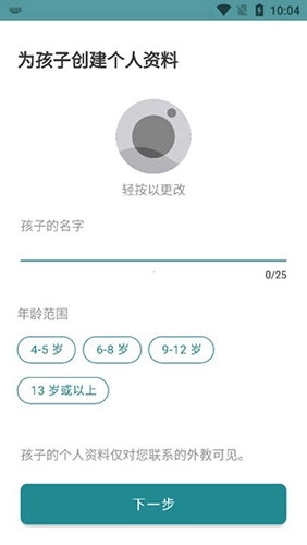 2、接下来要为孩子创建档案,输入名字下一步。