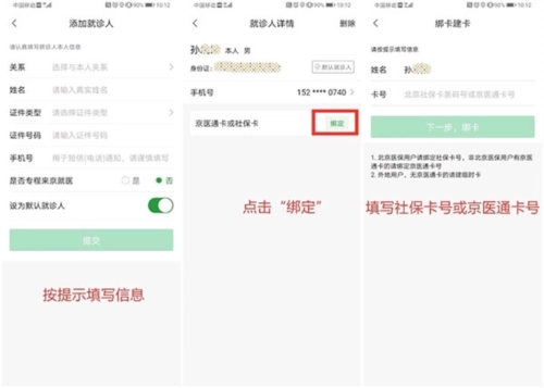 点击绑定按钮,绑定京医通卡或北京社保卡卡号,即可完成就诊人信息的绑定操作。