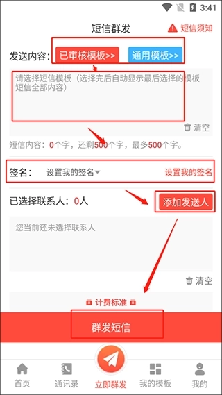 6、在群发这个版块中,可以选择模板,然后设置我的签名,添加发送人,最后群发短信。