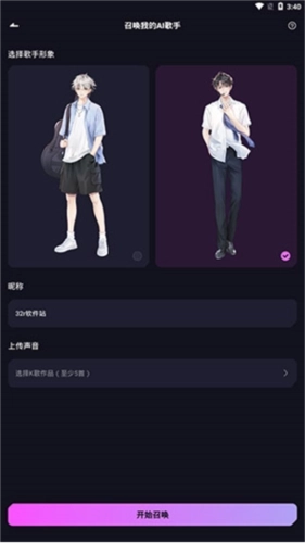 3、【召唤AI歌手】需先选定歌手形象,填写昵称,并上传个人的K歌作品。
