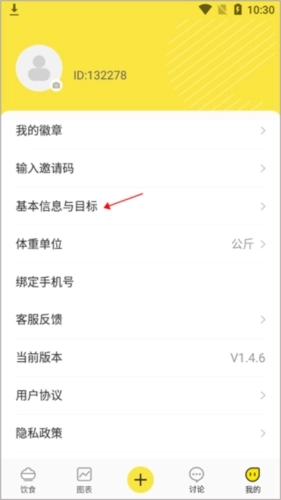 1、登录闪电减肥日记软件账号后,在“我的”页面点击“基本信息与目标”选项。