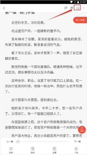 3、进入到小说阅读页面,点击空白处,就会弹出很多功能,右上角有一个耳机的图案。