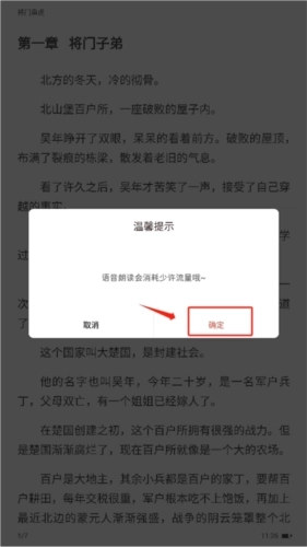 4、第一次使用的话会出现一个语音朗读流量的消耗,点击“确定”就可以了。