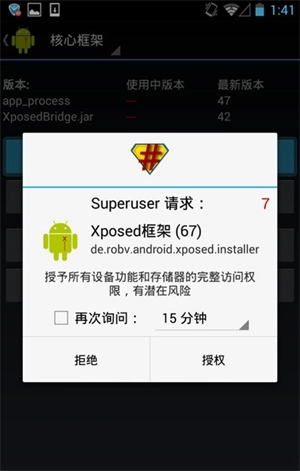 2、点击后进入框架安装、升级界面,我们点击“安装/更新”按钮,此时会弹出ROOT授权提示,点击许可即可。