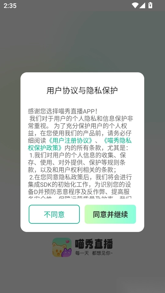 首先打开软件,阅读协议与隐私保护内容后,点击“同意并继续”按钮即可进入。