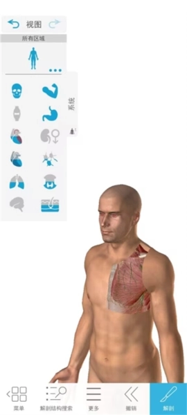 1、进入解剖和生理学软件中,我们可以看见人体区域、系统、大体解剖实验室、显微镜解剖结构等选项;