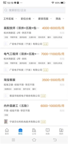 3、进入“职位”界面后,能浏览到大量招聘信息,用户还可以根据自身需求,对所在区域和目标工作职位进行筛选。