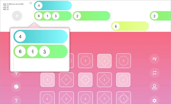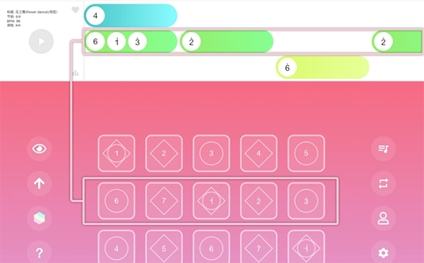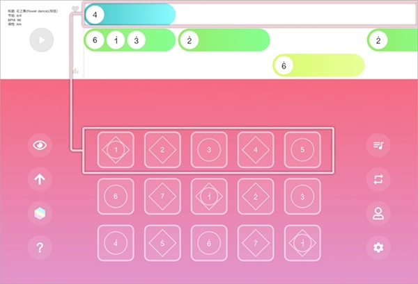 3、点击歌曲标题后稍作等待,乐谱就会加载到练习界面;乐谱共有三行,其中第一行与键盘的第一行按钮相对应。