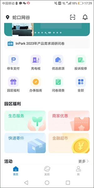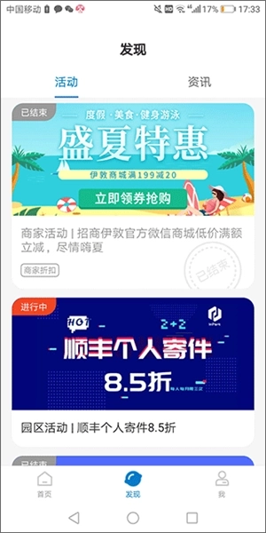 4、发现页面提供了园区附近各种商业优惠活动信息