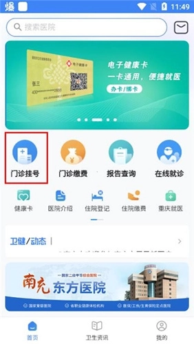 1、该软件,进入软件之后,在首页面可以看到:门诊挂号、门诊缴费、报告查询、在线就诊等,用户选择【门诊挂号】。