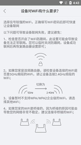 6、需要注意的是,设备对WiFi有要求,建议用户避免以下问题: