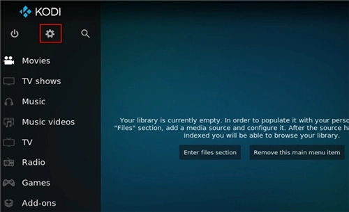 1、新安装好的Kodi启动后是英文版的界面,Kodi包含多国语言,我们可以设置改成简体中文界面,点击设置设置齿轮键;