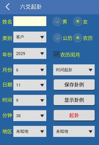 2、六爻起卦:提供六种起卦方法,包括数字起卦、时间起卦、手选起卦、铜钱起卦、分秒起卦、随机起卦。用户可以根据自己的需求选择合适的起卦方式进行占卜,以求得更准确的结果。