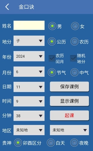 4、金口诀:提供六壬金口诀起课内容,包括人元、贵神、将神、地分、空亡、四大空亡、课内神煞、课内旺衰等,用户可以使用这些功能进行六壬金口诀的学习和应用。