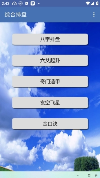 综合排盘是一款匠心独运的全能算卦应用,汇集了八字排盘、六爻起卦、玄空风水、六壬金口诀、奇门遁甲、金口诀六大风水算卦功能。综合排盘免费版提供专业而全面的命理预测与风水分析,旨在满足用户多元化的占卜需求,助您深入洞悉命运轨迹,明智规划生活与事业。软件提供了专业、全面的命理预测和风水分析服务,满足用户多样化算卦需求,助用户深入了解个人命运走势和命理特质,做出相应的规划和决策,实现生活品质的提升。通过使用综合排盘,用户可以了解自己的命理特质,包括命宫、胎元、四柱神煞等,获取对未来的预测和指导以及风水格局来布置家居和办公场所,助用户更好地规划未来的生活和事业。有感兴趣的小伙伴可以到本站体验一下!