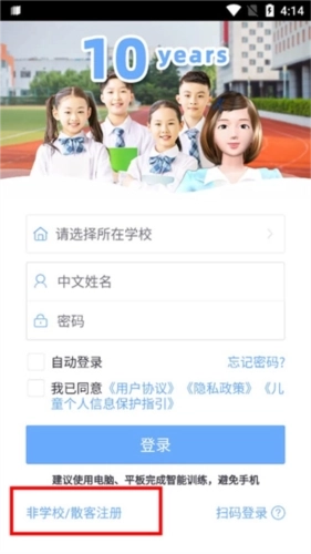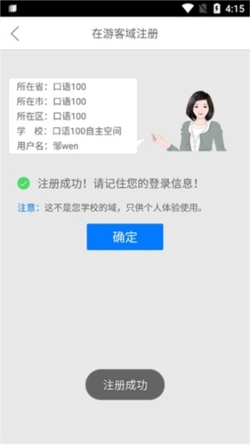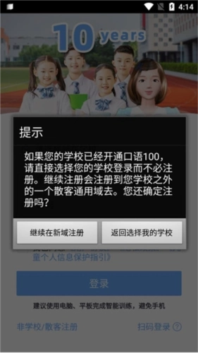 2、注册前请注意:若您所在学校已开通口语100服务,可直接选择学校入口登录,无需另行注册;若继续注册,账号将归属到学校之外的散客通用域。