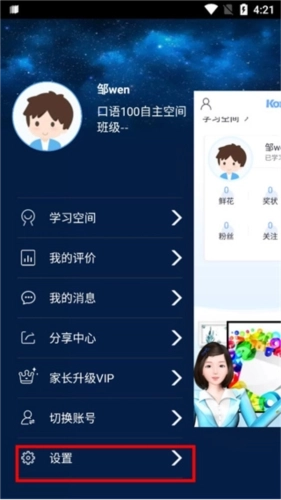 1、首先我们打开口语100应用,进入应用后点击左上角的个人头像图标,接着点击设置选项;