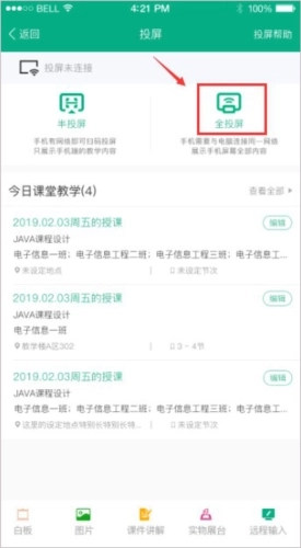 3、在投屏选择页面点击右侧【全投屏】进入全投屏页面;