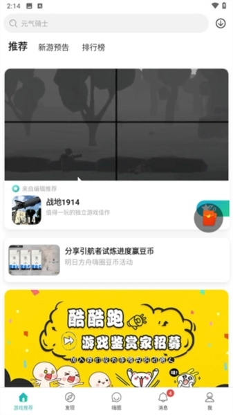 1、打开酷酷跑应用后,进入首页就能看到顶部的【推荐】板块,编辑团队会每天为用户推荐优质有趣的游戏。