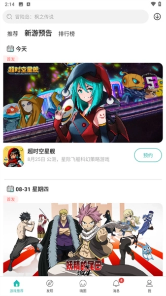 2、推荐栏的旁边设有新游预告板块,每天首发的游戏以及各类即将上线的游戏都会在这里展示,大家可以通过这个页面及时发现新游戏。
