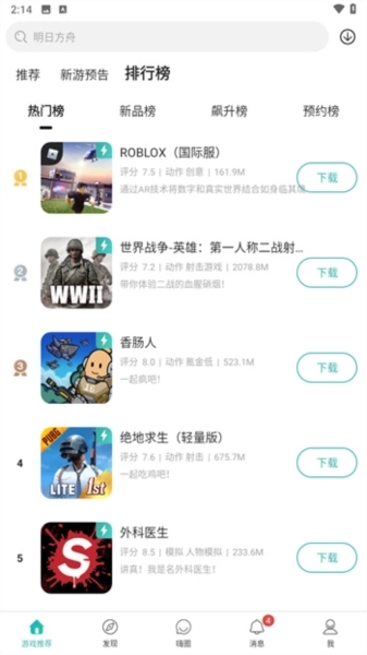 3、新游预告的旁边设有排行榜,该排行榜涵盖热门榜、新品榜、飙升榜、预约榜等多个类别,能够分别契合不同玩家的喜好与需求,助力玩家轻松从榜单里找到自己想要体验的游戏。