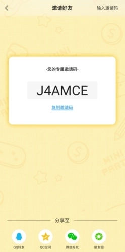 2、可以通过输入邀请码邀请,也可以将链接发给QQ好友、QQ空间、微信好友和朋友圈。