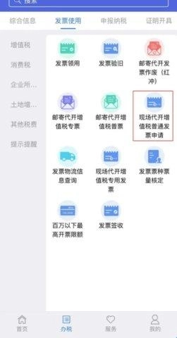 你可以这样操作:打开江苏税务应用,找到【办税】板块,进入后点击【发票使用】,从中选择【现场代开增值税普票】功能;也可以直接在搜索栏输入功能名称,快速进入该页面。